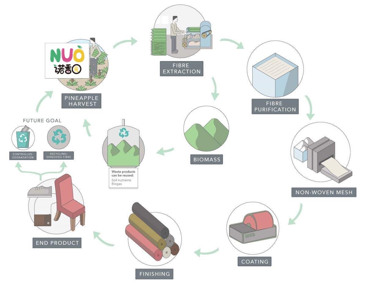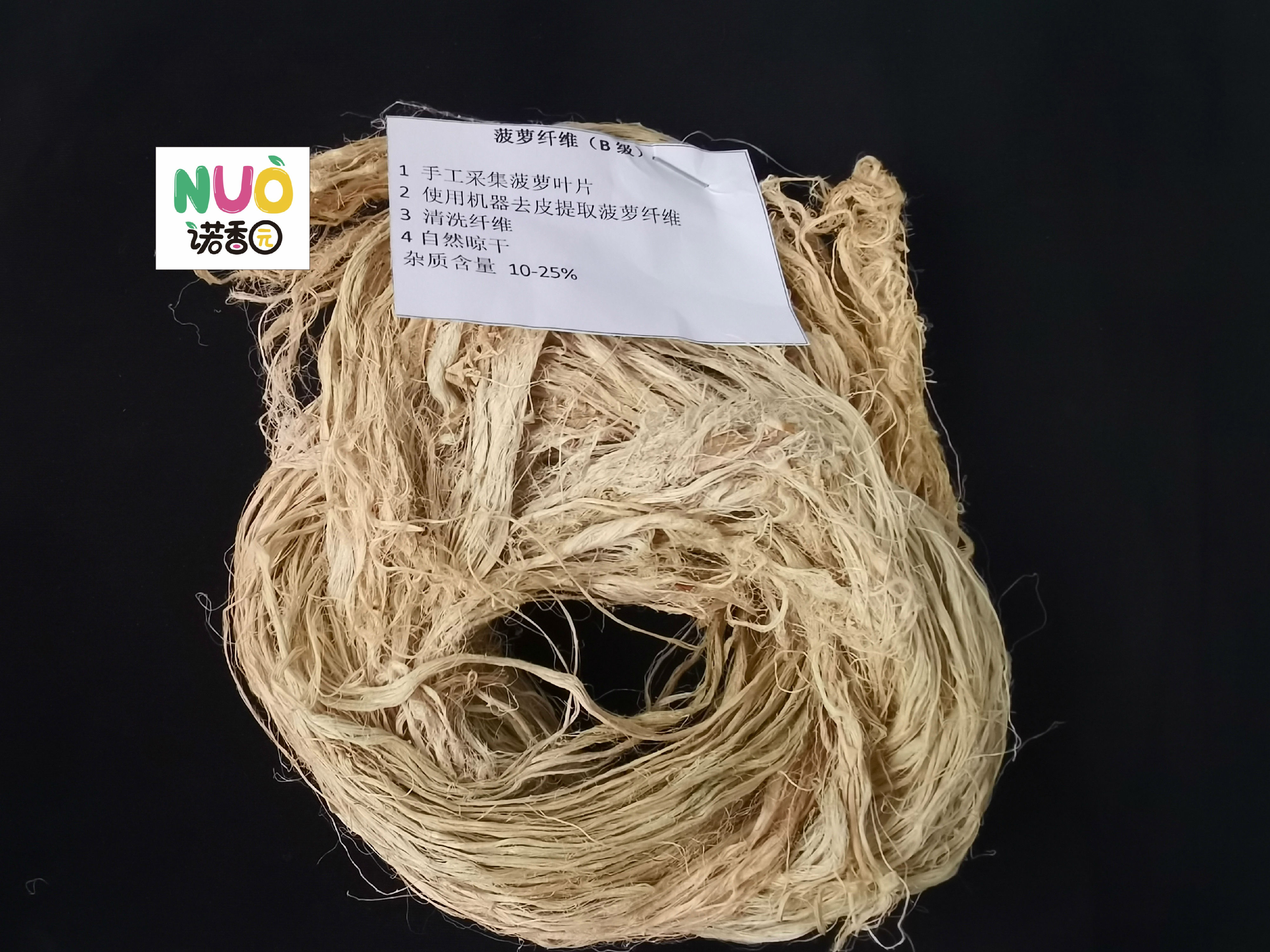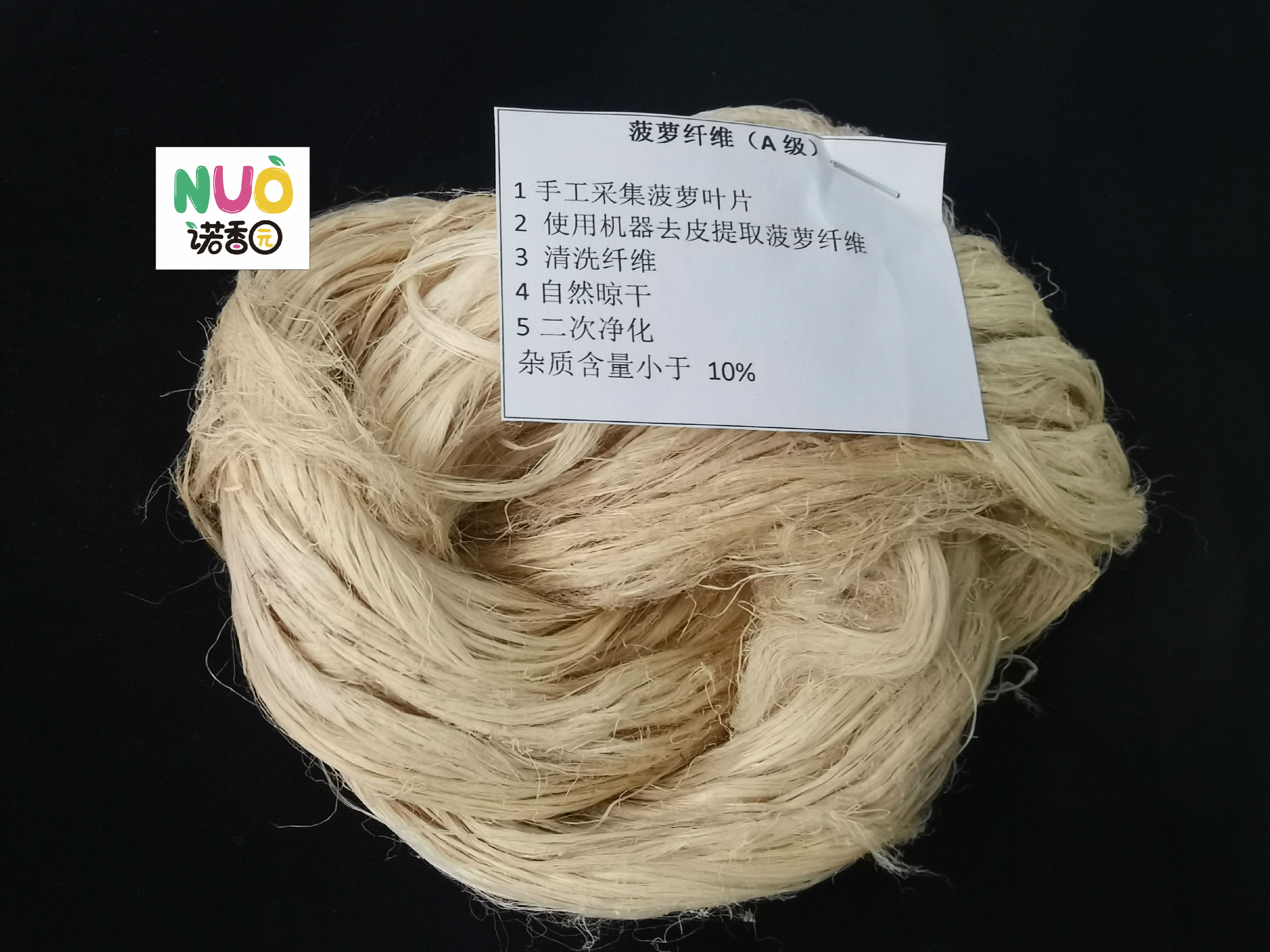 Pineapple fiber can be made by hand or mechanical stripping, mechanical stripping using ramie or jute stripping machine, after obtaining the leaves for green treatment, and then fully washed with water, sun drying, the oxidation of sunlight to make the fiber white and bright, that is, pineapple leaves scraping green water to dry the raw hemp. The pineapple fiber after proper chemical treatment can be spinning on cotton spinning equipment, wool spinning equipment, flax and jute spinning equipment.